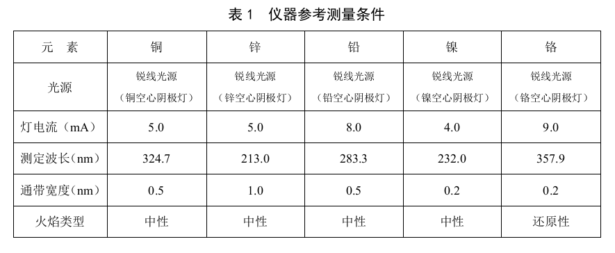 土壤和沉積物經(jīng)酸消解后,試樣中銅、鋅、鉛、鎳和鉻在空氣-乙炔火焰中原子化,其基態(tài)原子分別對銅、鋅、鉛、鎳和鉻的特征譜線產(chǎn)生選擇性吸收,其吸收強(qiáng)度在一定范圍內(nèi)與銅、鋅、鉛、鎳和鉻的濃度成正比。