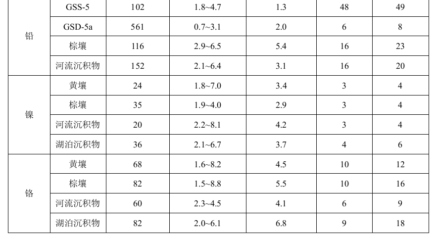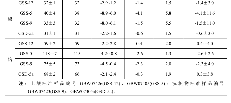 六家實(shí)驗(yàn)室分別對有證標(biāo)準(zhǔn)樣品GSS-5和GSD-5a中的鉛進(jìn)行了6次重復(fù)測定:相對誤差范圍分別為-0.5%~3.0%和-1.9%~2.9%;相對誤差最終值分別為1.7%±2.8%和 0.3%±4.2%。 六家實(shí)驗(yàn)室分別對有證標(biāo)準(zhǔn)樣品GSS-12、GSS-5、GSS-9和GSD-5a中的鎳進(jìn)行了6次重復(fù)測定:相對誤差范圍分別為-2.9%~1.2%、-8.9%~6.0%、-8.0%~6.1%和-2.2%~1.6%;相對誤差最終值分別為-1.4%±3.0%、-4.1%±11.6%、-1.5%±11.0%和-0.6%±3.0%。 六家實(shí)驗(yàn)室分別對有證標(biāo)準(zhǔn)樣品GSS-12、GSS-5、GSS-9和GSD-5a中的鉻進(jìn)行了6次重復(fù)測定:相對誤差范圍分別為-2.2%~2.8%、-4.2%~-0.8%、-4.5%~0.4%和-2.1%~2.4%;相對誤差最終值分別為0.4%±4.0%、-2.6%±2.6%、-2.3%±4.0%和0.3%±3.8%。