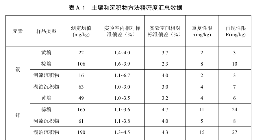 家實(shí)驗(yàn)室對不同類型的土壤和沉積物統(tǒng)一樣品進(jìn)行了測定,方法的重復(fù)性和再現(xiàn)性等精密度數(shù)據(jù)見表A.1。