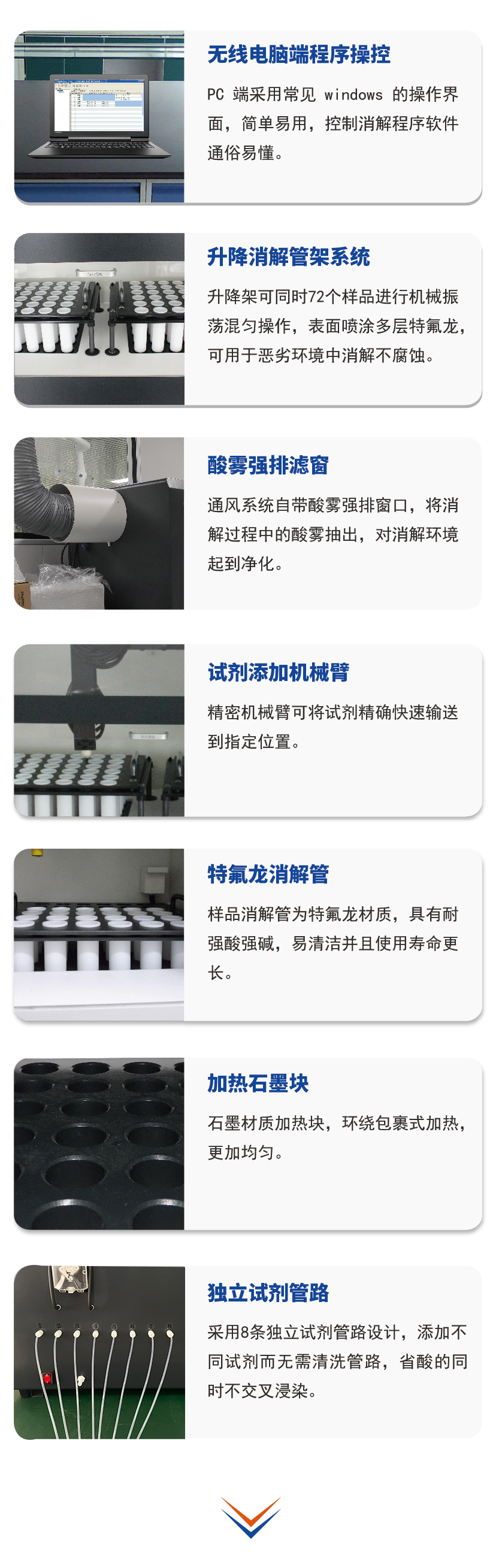 全自動完成加酸、消解、趕酸、定容、搖勻和酸氣排放,讓繁瑣的消解變得更加輕松,一鍵啟動,自動執行后直接取樣上機分析。