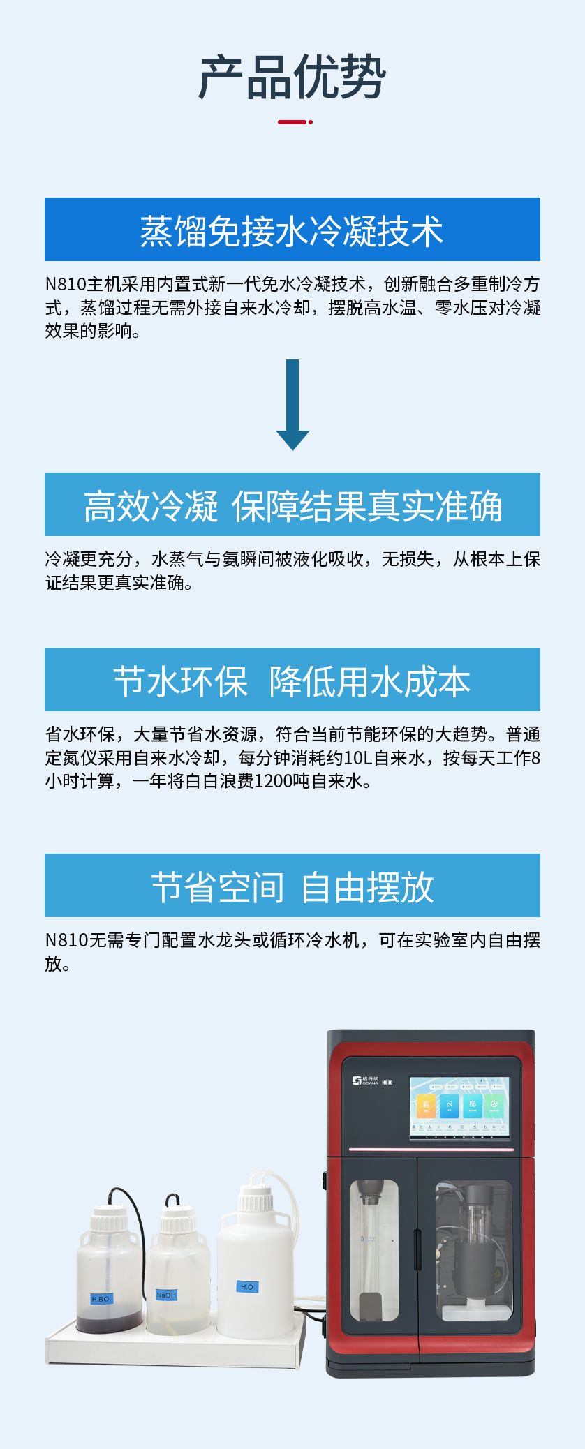 冷凝更充分,水蒸氣與氨瞬間被液化吸收,無損失,從根本上保證結果更真實準確。