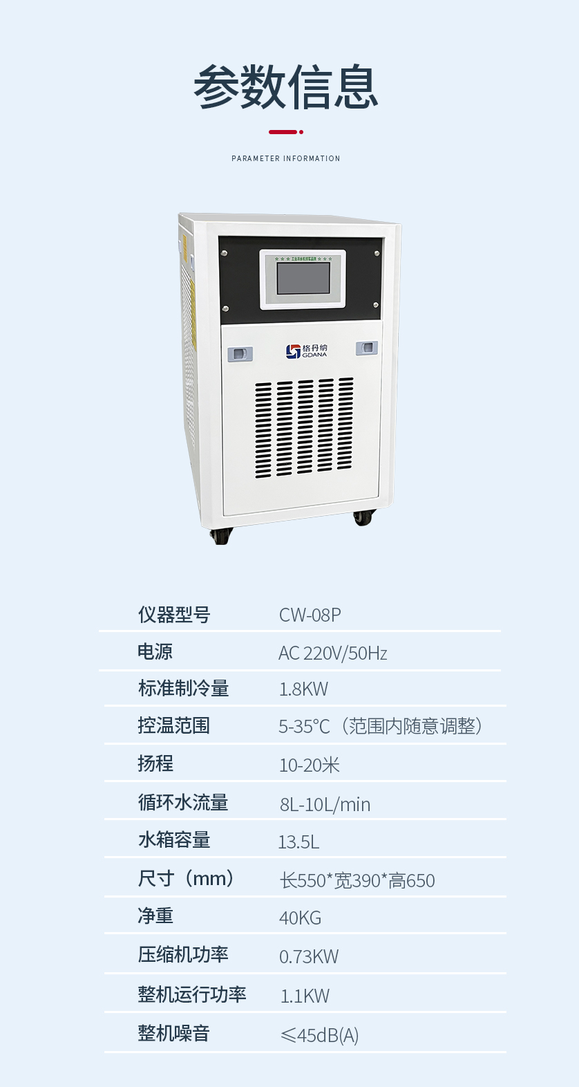 冷水機制冷系統將水箱內的水冷卻,而后機器內部的水泵把低溫的水注入需要冷卻的設備內。水帶走機器內部的熱量,變成高溫的水后回流到水箱進行降溫,如此循環交換冷卻,起到為設備冷卻的作用。