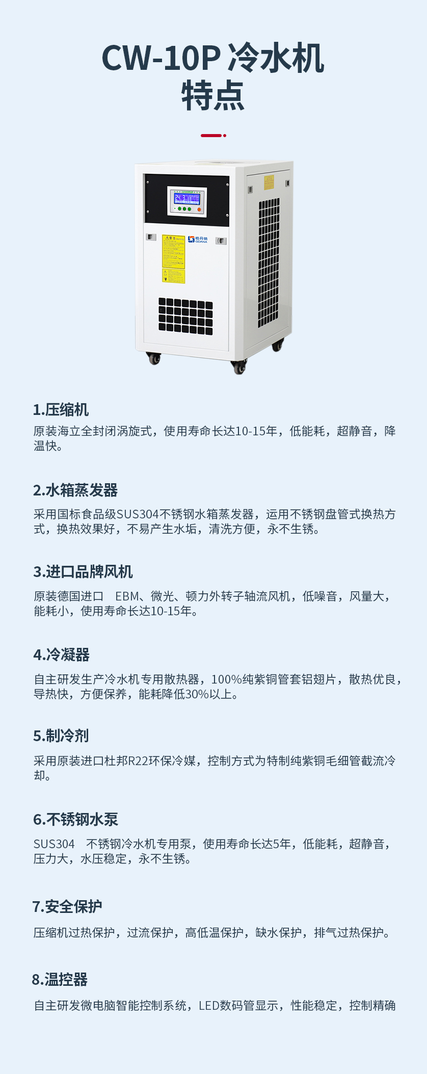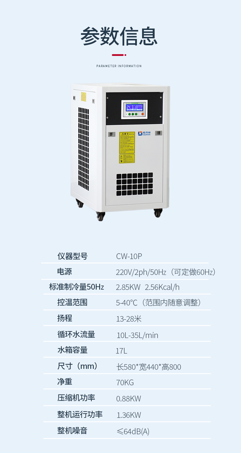 冷水機(jī)制冷系統(tǒng)將水箱內(nèi)的水冷卻,而后機(jī)器內(nèi)部的水泵把低溫的水注入需要冷卻的設(shè)備內(nèi)。水帶走機(jī)器內(nèi)部的熱量,變成高溫的水后回流到水箱進(jìn)行降溫,如此循環(huán)交換冷卻,起到為設(shè)備冷卻的作用。