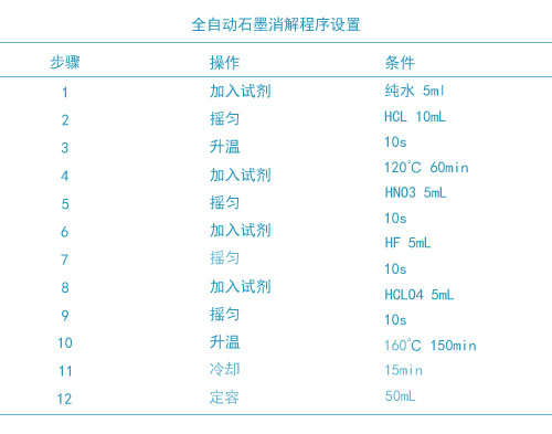 本次試驗使用HCl-HNO3-HF-HClO4混合酸消解體系,將土壤中的晶格全部打開,進行全消解。因用酸量較少,只需準確稱取0.1000-0.2000g左右干燥土壤樣品至特氟龍消解管中,放入全自動消解儀石墨孔中,設置好系統消解方法只需要一鍵啟動就可以自動加酸、搖勻、加熱消解、趕酸、定容。全自動石墨消解儀系統的消解程序及條件見表下面表格。全自動消解儀自動定容到50mL,每批樣品加做雙份全程序空白。