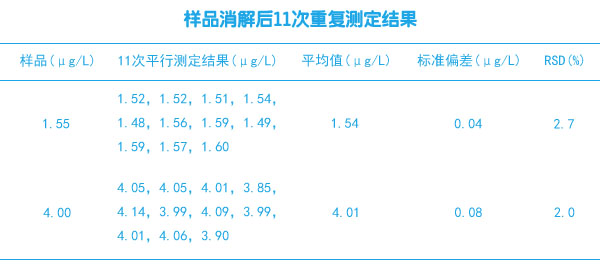 分別對濃度為1.55μg/L的固廢樣品和濃度為4.00μg/L的標準樣品消解后進行重復測定11次,測定結(jié)果見表1。
