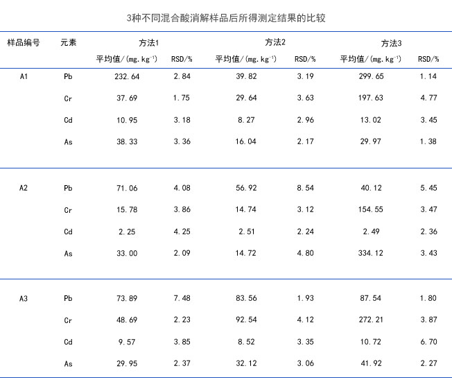 表2所示為3種不同混合酸消解樣品后所得測定結果的比較。