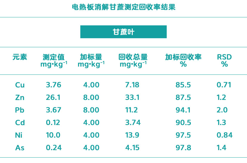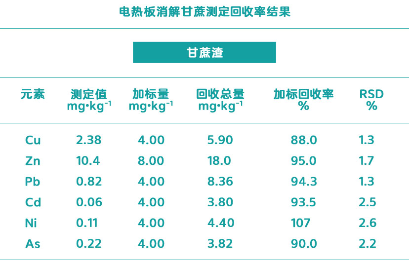 由表中得出,實驗測定值均在標準值范圍內,滿足實驗要求,電熱板消解方法適用于甘蔗、植物等的消解。