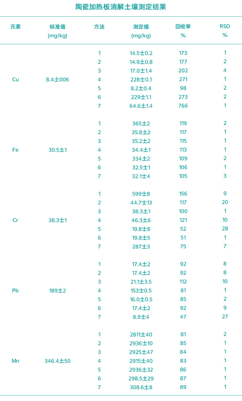 新型陶瓷加熱板通過(guò)遠(yuǎn)程數(shù)控模式,可避免人員受到酸氣的傷害,同時(shí)在消解過(guò)程可以精準(zhǔn)控制溫度;本些實(shí)驗(yàn)過(guò)程中運(yùn)用了新型陶瓷加熱板大加熱面積的優(yōu)勢(shì),進(jìn)行了大批量消解土壤樣品,減少消解耗時(shí)問(wèn)題、大大提高工作效率。