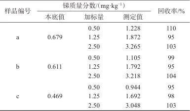 選取3種糖廠濾泥樣品,編號分別為a、b和c,分別加入低、中和高3個濃度水平的銻標準溶液,按1.4方法進行樣品處理,按照1.5方法分別測定,結果見表5。由表5可知,樣品加標回收率為95%~110%,表明該方法具有較高的準確度。