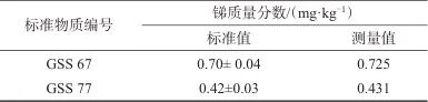 為進一步驗證方法的準確性,受標準物質(zhì)的局限性,采用土壤標準物質(zhì)GSS67、GSS77作為參考,各平行稱取3份,按1.4方法進行樣品處理,按照1.5方法分別測定,標準物質(zhì)的標準值和測定結果見表6。由表6可知,銻元素的測定值均在證書標準值不確定度范圍內(nèi),表明該方法準確可靠。